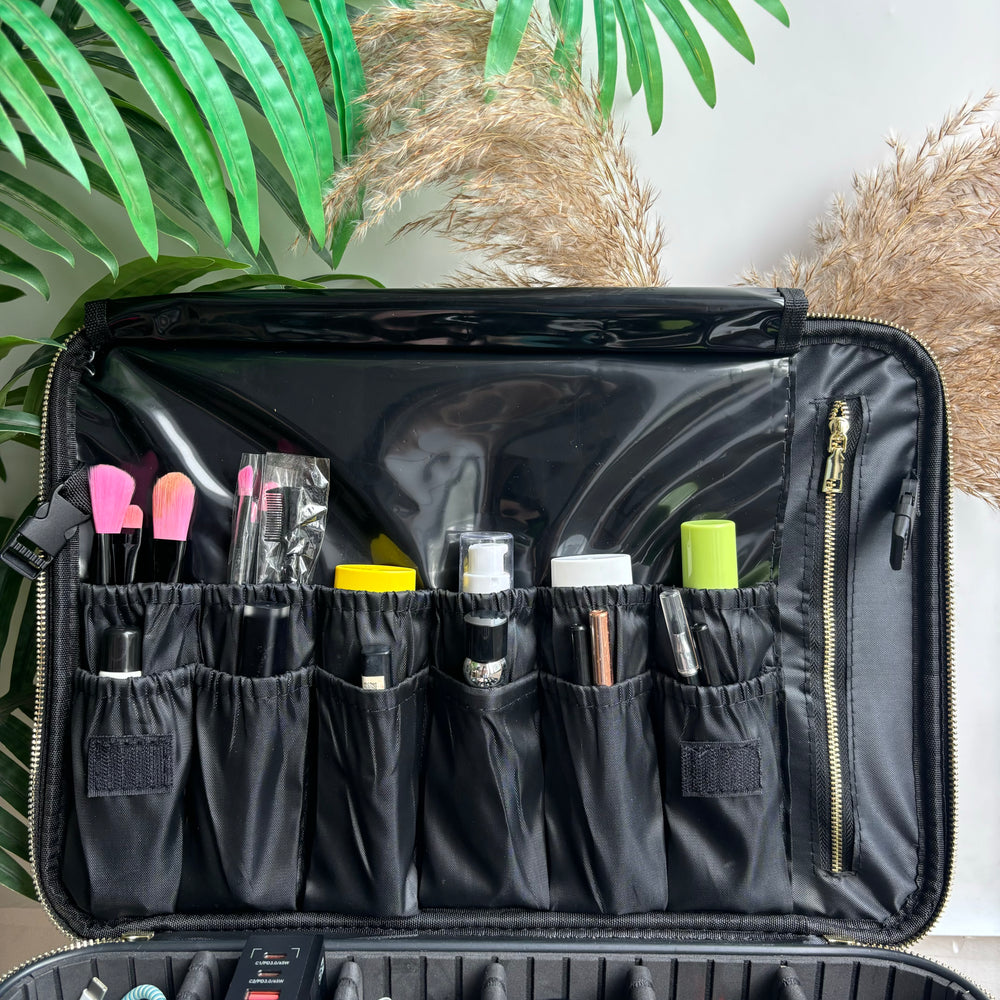 It features multiple adjustable and removable sections to perfectly fit your needs. Designed for convenience, it comes with a sling handle for easy carrying and a back strap that easily attaches to your trolley bag for seamless travel. Perfect for organizing on the go!