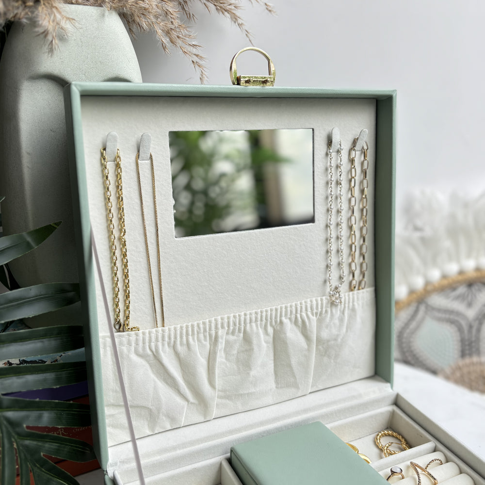 Our Box in box organiser is an organiser that is sure to add an element of style to your wardrobe. It has multiple sections for rings, smaller as well as bigger jewellery. It has separate section to fit 4 chains and contains a small mirror too.