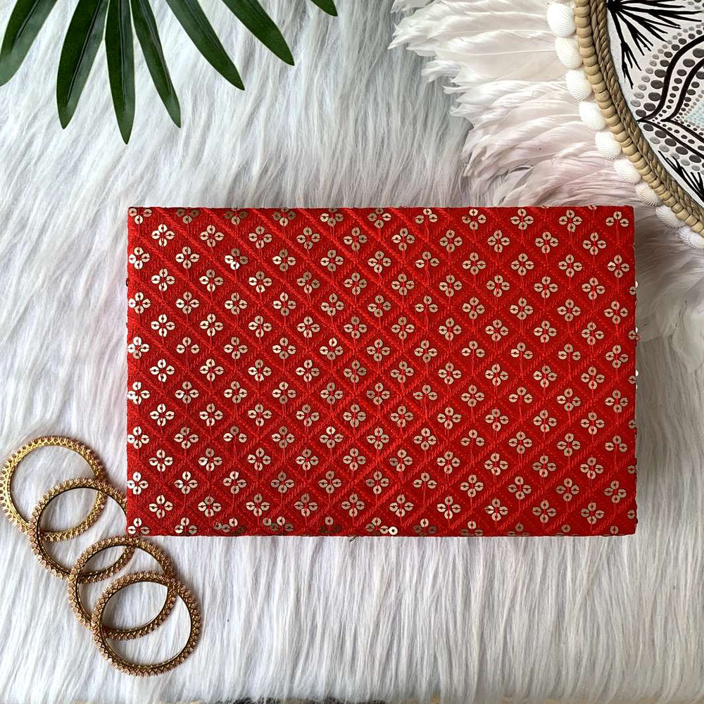 Our Heritage Chuda boxes are made of hard fibre with velvet lined inside. The outside is a mix of sequinned embroidered fabric as well as plain raw silk.