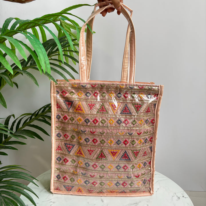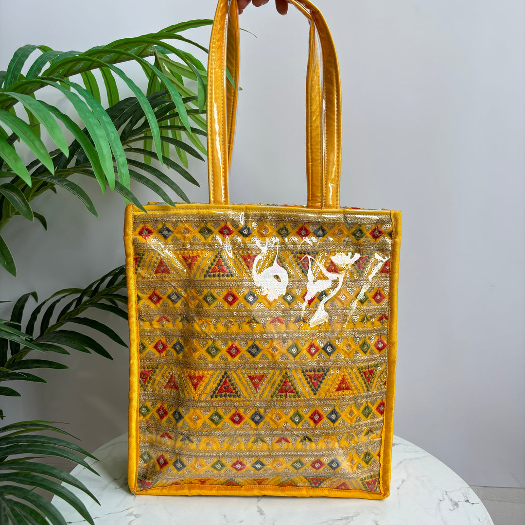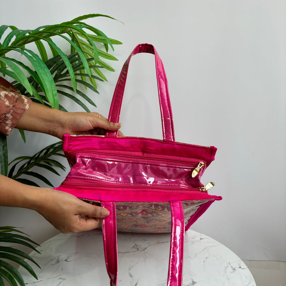 Our Devotee pooja bags come with two sections and a long handle. The bags are covered with a plastic coating to avoid damage to the fabric and can be easily cleaned with a wet cloth. The bags have embroidered fabric on both sides