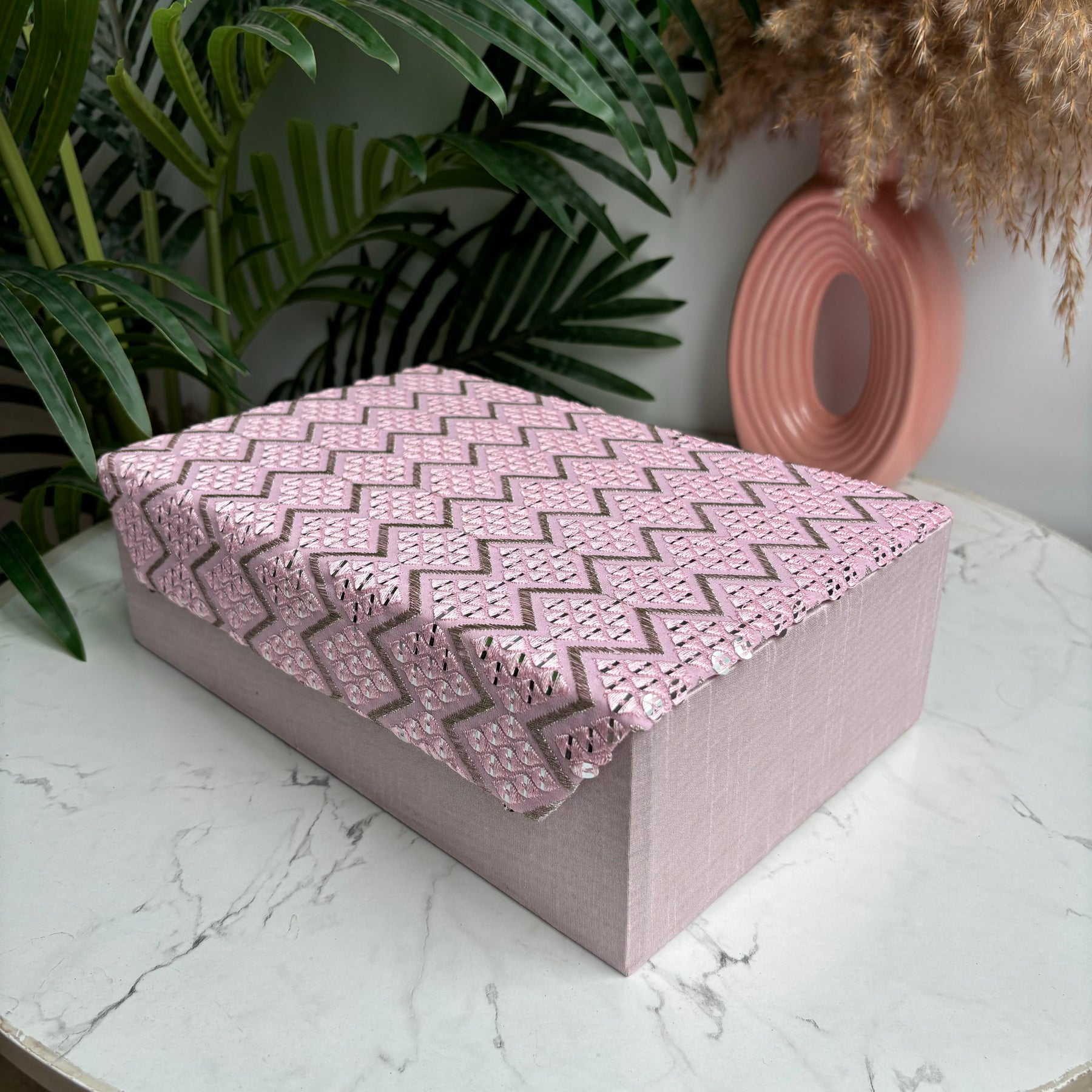 Our Mirror Chuda boxes are made of hard fibre with velvet lined inside. The outside is a mix of sequinned embroidered fabric as well as plain raw silk.