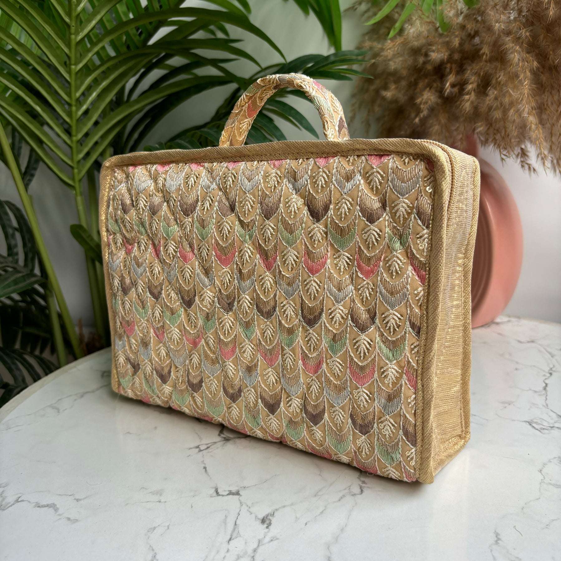 Our Roll-In-One Jewellery organiser is a travel friendly pouch made of embroidered fabric. It has 4 attached pouches for your earrings, bracelets and other accessories. The upper part has 1 big section to store a necklace or a bigger accessory. It has a string for rings as well as a roll for your bangles and watches.