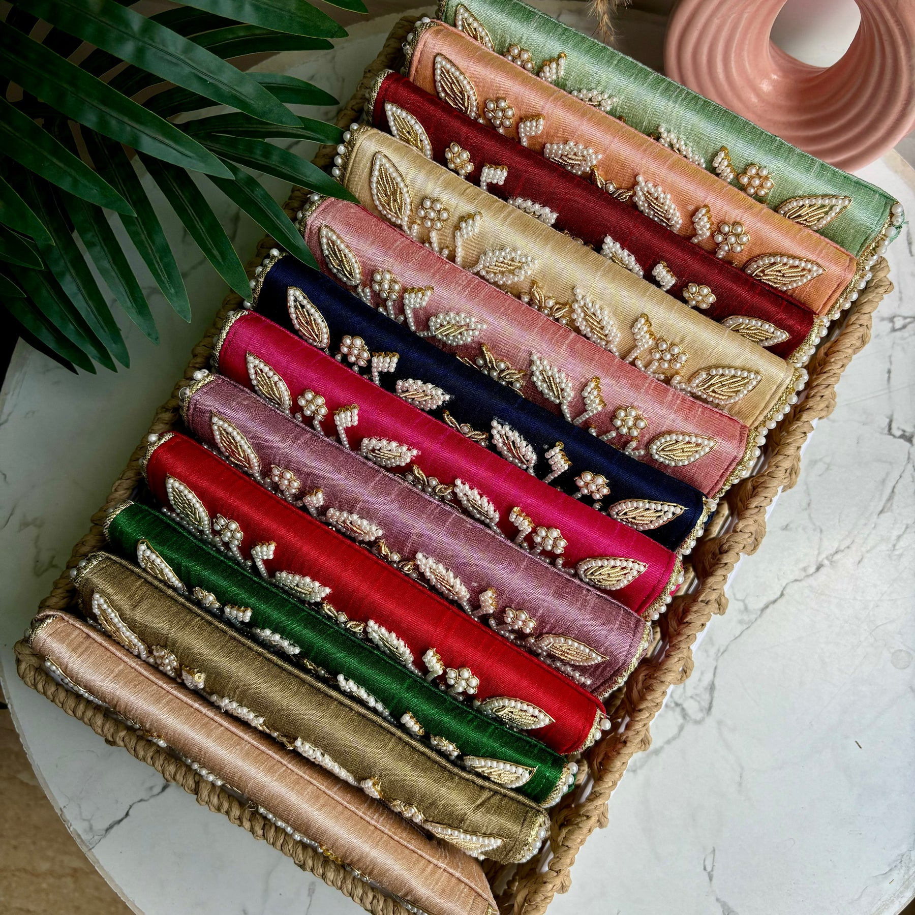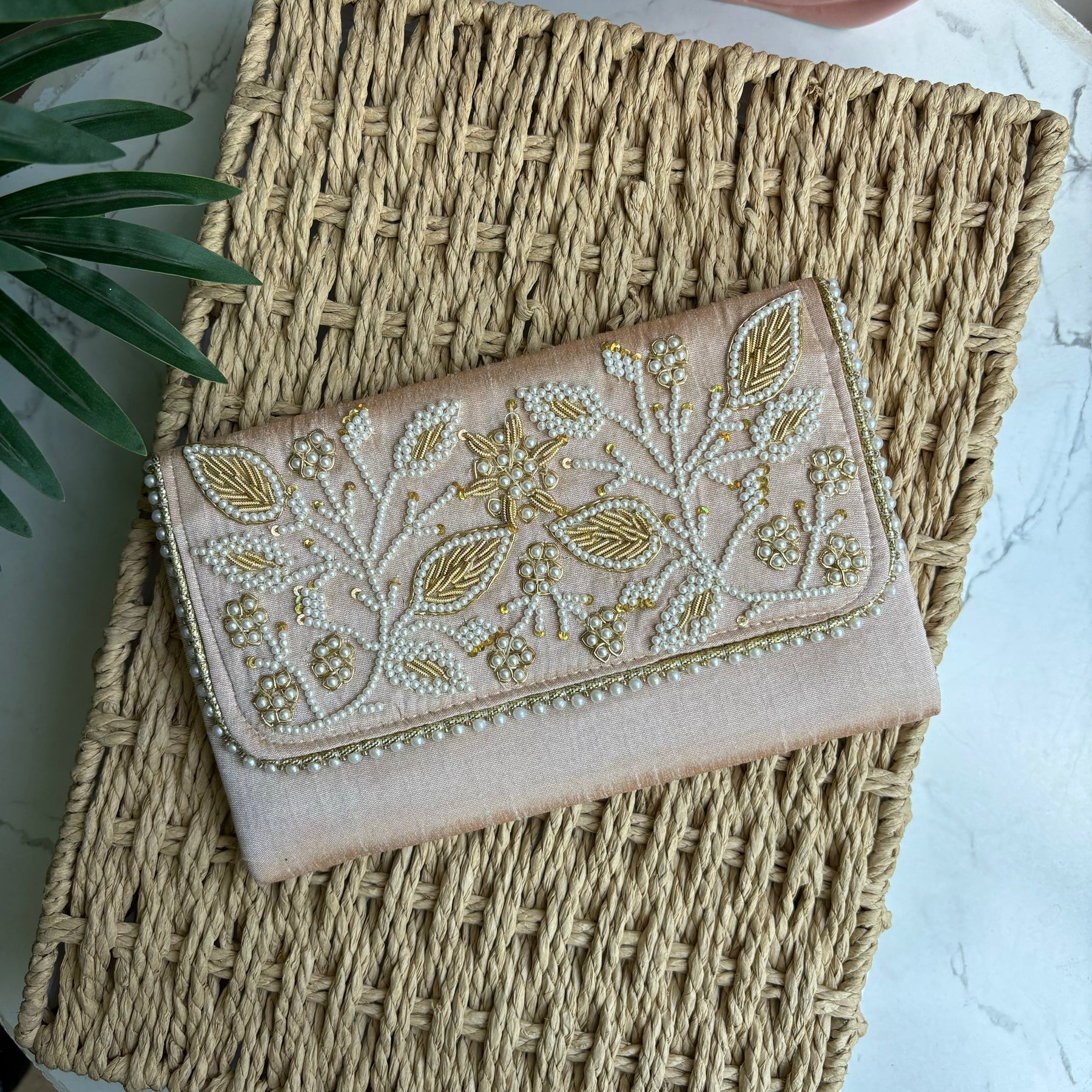Our Imperial clutch is made of raw silk fabric with intricate handworked beads and zari design on the front. It has a chain on the back as well as on the inside for additional storage.