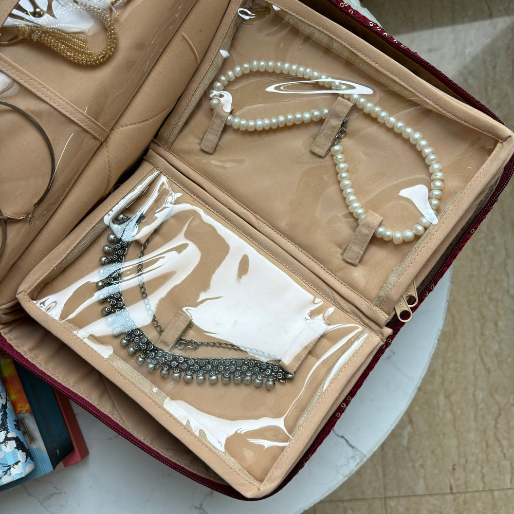The cushioned compartments keep each piece in place while the compact design fits seamlessly into your wardrobe or travel bag. Elegant, efficient, and a total game-changer for necklace lovers.