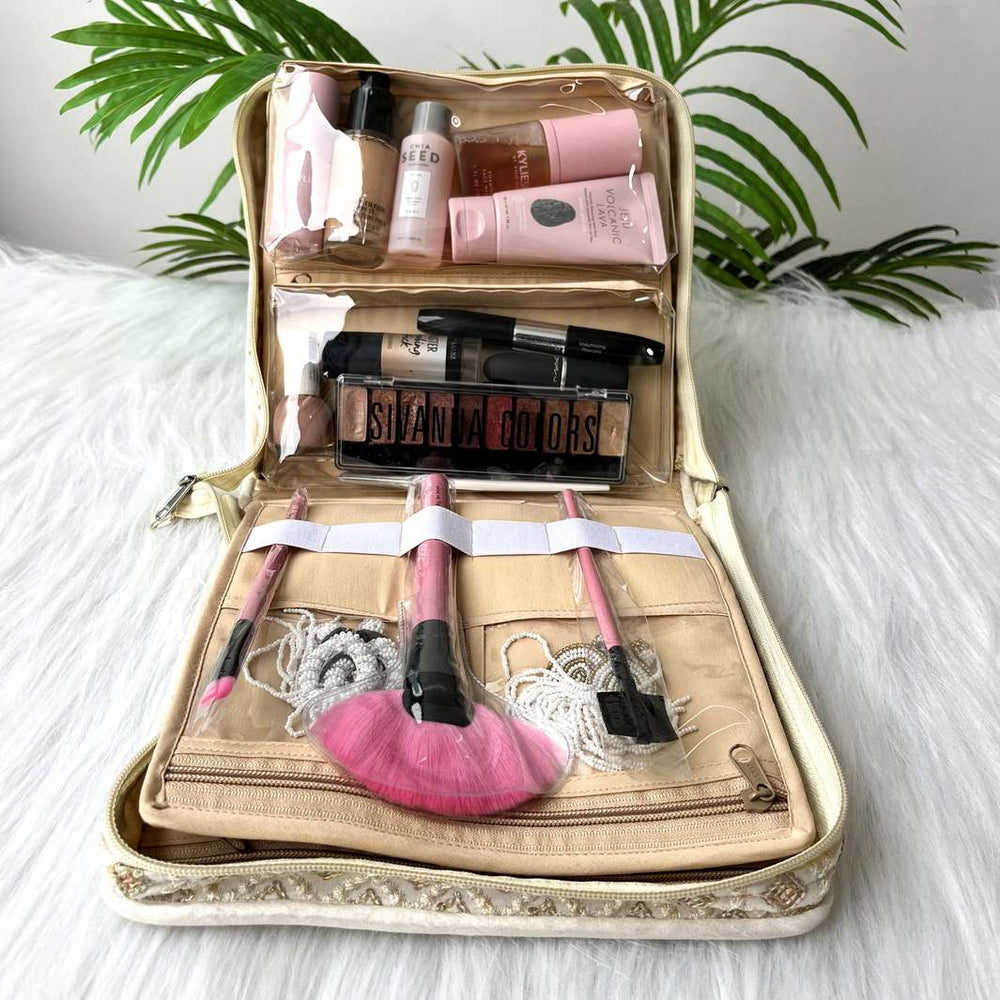 Our travel utility booklet has 6 sections for earrings, 2 sections for watches/bracelets, 2 big sections for necklace sets, 2 pouches for cosmetics and makeup products and 6 brush holders.
